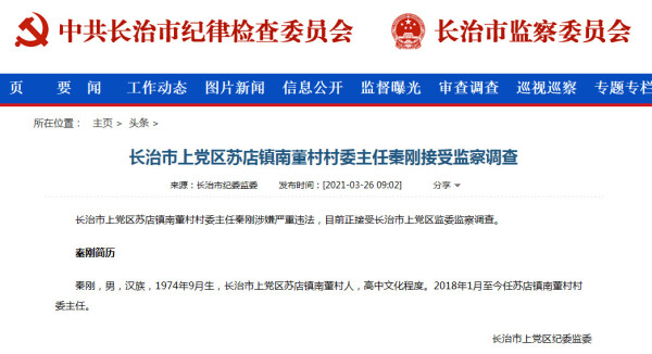 长治市上党区苏店镇南董村村委主任秦刚涉嫌严重违法,目前正接受长治市上党区监委监察调查。