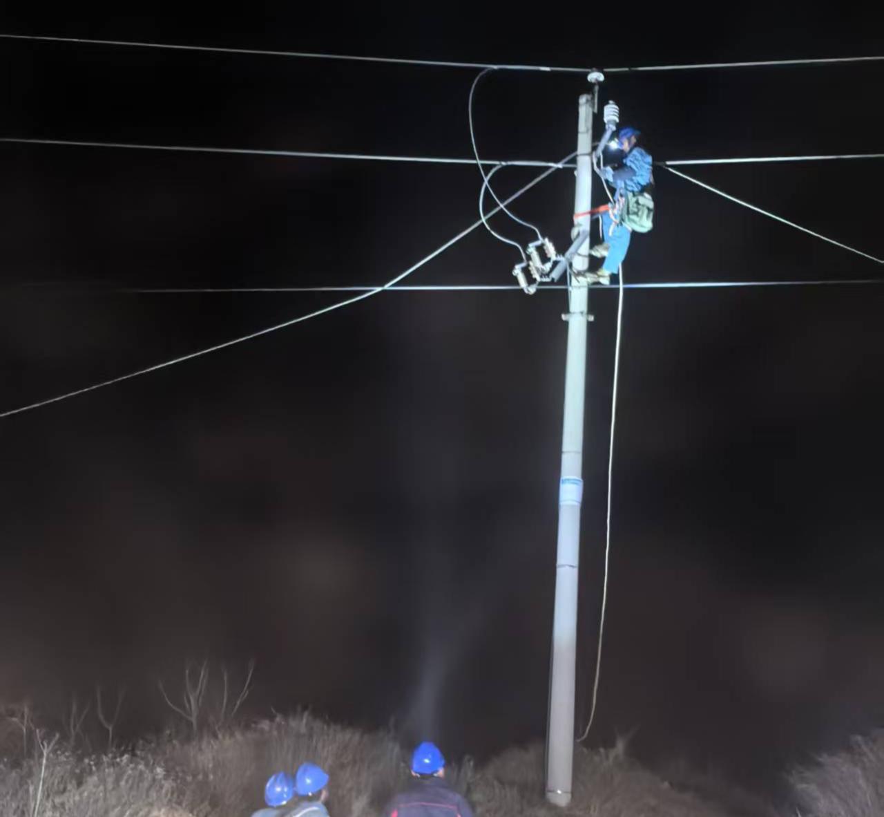 抢修人员借用应急照明灯和抢修车灯光将作业区域照的通明,在做好防风加固和安全防护措施后,抢修人员顶着刺骨寒风分工协作,有的更换受损导线和金具,有的清理倒落的树枝,高空作业时,阵风不时干扰操作,抢修人员腰间系紧安全绳,双手紧紧握住工具,在电杆上稳步开展作业;地面人员默契配合,传递物资、监测设备,整个抢修流程紧张而有序,在当晚21:37分时许,随着这一段导线艰难的接续完成,受损线路全面修复,所有安全措施检查无误后,恢复了供电。