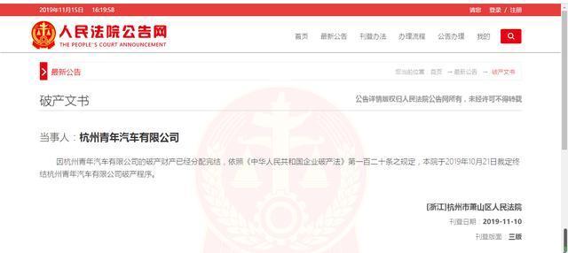 据人民法院公告网显示,因杭州青年汽车有限公司的破产财产已经分配完结,依照《中华人民共和国企业破产法》第一百二十条之规定,杭州市萧山区人民法院于2019年10月21日裁定终结杭州青年汽车有限公司破产程序。青年汽车法定代表人为庞青年,曾因“水氢发动机”而出名。