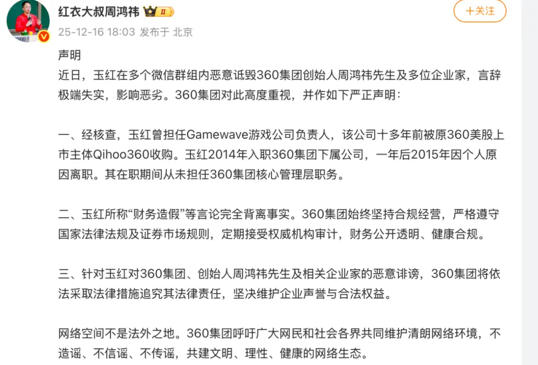 对此,周鸿祎通过微博否认“财务造假”一事。“经核查,玉红曾担任Gamewave游戏公司负责人,该公司十多年前被原360美股上市主体Qihoo360收购。玉红2014年入职360集团下属公司,一年后2015年因个人原因离职。其在职期间从未担任360集团核心管理层职务。”周鸿祎称,360集团将依法采取法律措施追究其法律责任,坚决维护企业声誉与合法权益。