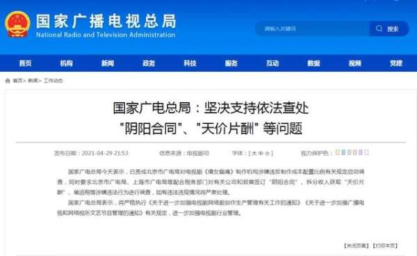国家广电总局今天表示,已责成北京市广电局对电视剧《倩女幽魂》制作机构涉嫌违反制作成本配置比例有关规定启动调查,同时要求北京市广电局、上海市广电局等配合税务部门对有关公司和郑爽签订“阴阳合同”、拆分收入获取“天价片酬”、偷逃税等涉嫌违法行为进行调查,如有违法违规情况将严肃处理。 国家广电总局表示,将严格执行《关于进一步加强电视剧网络剧创作生产管理有关工作的通知》《关于进一步加强广播电视和网络视听文艺节目管理的通知》有关规定,进一步加强电视剧行业管理。 |